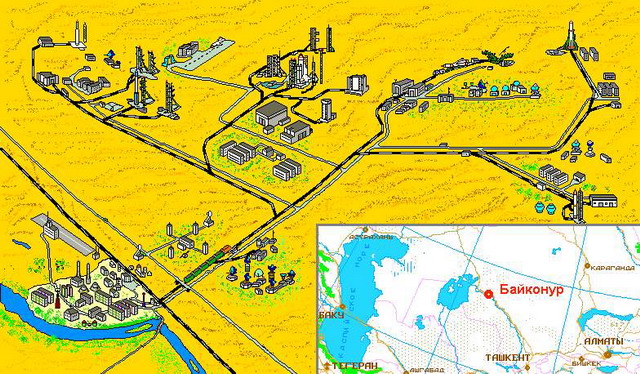 В 1954 году была создана Государственная комиссия по выбору места строительства космодрома. Проведя рекогносцировку нескольких районов страны, комиссия вышла с предложением о размещении космодрома в пустынном районе Казахстана восточнее Аральского моря, в нескольких сотнях километров от поселка Байконыр (по-русски – Байконур). Это место имело ряд преимуществ перед другими: малонаселенность не только в районе космодрома, но и по трассе запускаемых ракет, равнинная полупустынная местность, наличие крупнейшей среднеазиатской реки Сыр-Дарьи, проходящие вблизи железнодорожная магистраль и автомобильная трасса, более 300 солнечных дней в году и, главное, близость к экватору, дающая возможность использовать для запусков дополнительную скорость вращения Земли.