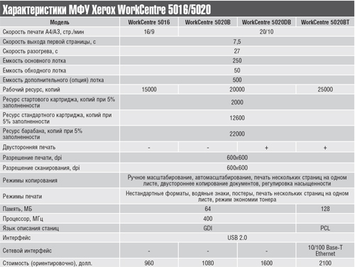 Однако следует отметить, что модели Xerox WorkCentre 5016, 5020B и 5020DB не имеют сетевого интерфейса — они рассчитаны на подключение к рабочей станции или принт-серверу посредством USB. Модификация 5020DN лучше подходит для корпоративных сетей, поскольку оснащена сетевым интерфейсом 10/100 Base-T Ethernet. Помимо этого, устройство отличается большим объемом памяти (128 МБ), поддержкой языка описания страниц PCL, а также наличием функции пересылки отсканированного изображения на указанный почтовый ящик (Scan to Mailbox).