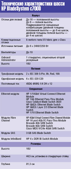 Шасси корпоративного класса BladeSystem с7000 имеет высоту 10U и позволяет разместить до 16 лезвий половинной высоты (двухпроцессорные блейд-серверы и блейд-хранилища), до 8 — полной высоты (двухпроцессорные и четырехпроцессорные блейд-серверы), до 8 — двойной толщины половинной высоты (iSCSI SAN-хранилище) и до 4 — двойной толщины полной высоты. Кроме отсеков для установки лезвий на лицевой панели располагаются отсеки для блоков питания и графический ЖК-экран Insight Display с диагональю 3 дюйма.