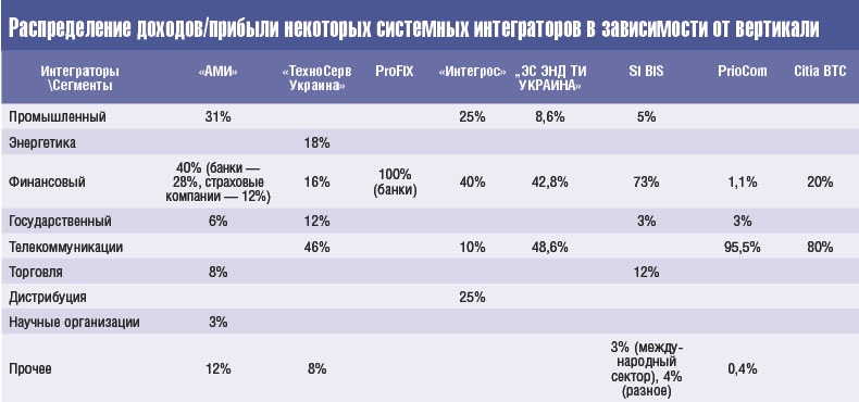Наибольшие доходы «ТехноСервУкраина» обеспечивают проекты для операторов связи, в то время как SI BIS специализируется на решениях для финансового сектора. ProFIX, в состав которой входит «Интегрос», также внедряет проекты для финансовых учреждений, дистрибуторов, телекоммуникационных операторов и производственных предприятий. Позиции «АМИ» традиционно сильны в банковской сфере и промышленности.