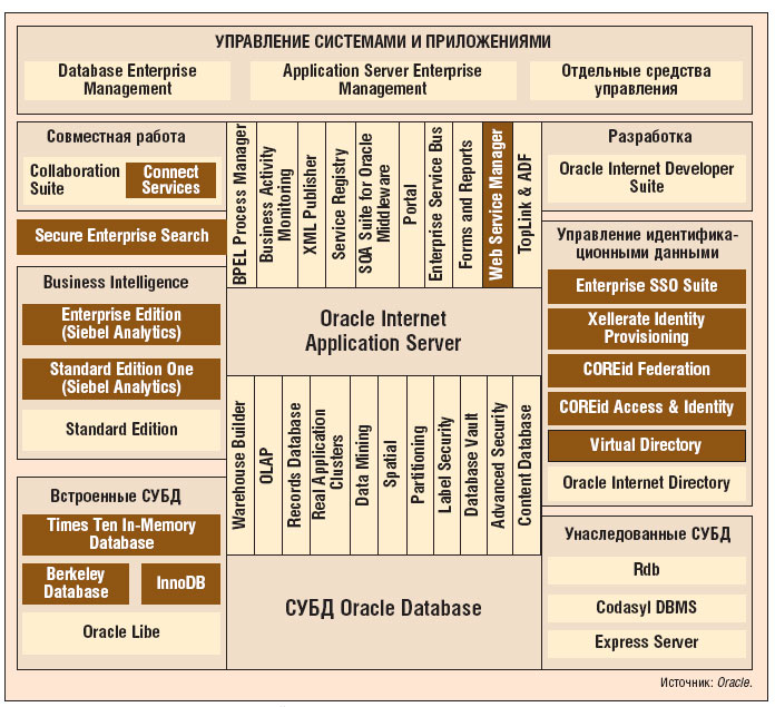 Обращает на себя внимание тот факт, что существенная часть отображенных на схеме продуктов не принадлежит ни к категории СУБД и бизнес-приложений, ни к связующему ПО, а традиционно относится к средствам управления ИТ-инфраструктурой. К примеру, инструменты для управления службами каталогов, идентификационными данными и однократной регистрацией пользователей на протяжении многих лет поставляются лидерами указанного сегмента рынка в соответствующих пакетах (IBM Tivoli, CA Unicenter и др.). Хотя то же относится и к системам администрирования СУБД и серверов приложений, у Oracle они фигурируют в продуктовой линейке Database. А ведь, к примеру, инструмент Application Ser-ver Enterprise Management куда более естественно смотрелся бы как компонент Oracle Fusion Middleware.