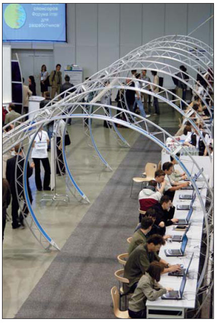 Помимо основных докладов и тематических семинаров, участники форума могли также ознакомиться с многочисленными стендами компаний-производителей и разработчиков. Интересно было видеть в рамках одного форума давних конкурентов — компании nVidia и ATi, каждая из которых представляла собственные платформенные решения с поддержкой новейших разработок Intel. Также свои стенды представили практически все крупные отечественные производители — “Квазар-Микро”, “Юстар”, “Версия”, “Навигатор”, “K-Trade”, “ДКТ” и многие другие.
