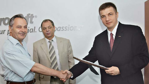 ![]() Эксперты из НАНУ и СБУ вручают сертификат генеральному директору “Microsoft Украина” Валерию Лановенко |
