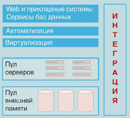 • Серверные ресурсы и ресурсы внешней памяти группируются в пулы и динамически распределяются между приложениями в процессе работы.