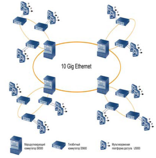 Магистраль построена на восьмислотовых коммутаторах ядра Quidway S6506R. Каждый из коммутаторов ядра оснащен резервной коммутационной матрицей для увеличения надежности решения.