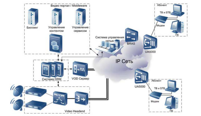 Давайте взглянем на IPTV глазами абонента. Абонент имеет у себя два оконечных устройства: xDSL-модем, который подключается к сети провайдера и может предоставлять услугу Internet, а так же Set Top Box — STB (абонентское устройство IPTV), который подключается к сети провайдера через Ethernet-порт. Модем, подключаемый к мультисервисной платформе доступа UA5000, выступает мостом между другими устройствами абонента и сетью провайдера. При включении абонентских устройств происходит их регистрация на широкополосном сервере доступа (BRAS), который выдает им IP-адреса и регистрирует в соответствующих VPN. Таким образом, STB пользователя имеет возможность обратиться к видеопорталу. В момент обращения к порталу пользователь вводит свои логин и пароль и получает доступ к электронной программе передач. В зависимости от информации о пользователе, хранящейся в биллинговой системе, он получает возможность использовать те или иные сервисы.