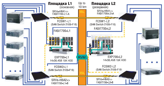 Внутри каждого центра обработки потоки данных перекрестно распределяются между парой независимых коммутаторов с отдельными линиями передачи данных. В рабочем режиме это снижает нагрузку на оборудование, а в случае аварийной ситуации исключает прекращение работы, поскольку все ключевые узлы продублированы. Связь между основным и резервным центрами также осуществляется двумя независимыми парами коммутаторов с продублированными ISL-соединениями посредством нескольких каналов Fibre Channel со скоростью 2 Гбит/с. Подобная схема гарантирует непрерывную работоспособность в случае серьезной аварии и модернизации аппаратного комплекса. Компоненты системы хранения можно временно отключать для замены или наращивания конфигурации.