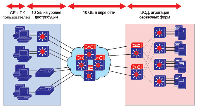 • Агрегирование трафика рабочих станций пользователей. Трафик пользовательских ПК за последние годы значительно вырос, в немалой степени по причине проникновения Gigabit Ethernet на рабочий стол. Как следствие, от коммутаторов рабочих групп (уровень дистрибуции) к ядру сети суммарный трафик становится мультигигабитным.