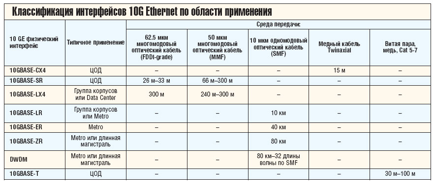 ![]() Классификация интерфейсов 10G Ethernet по области применения |