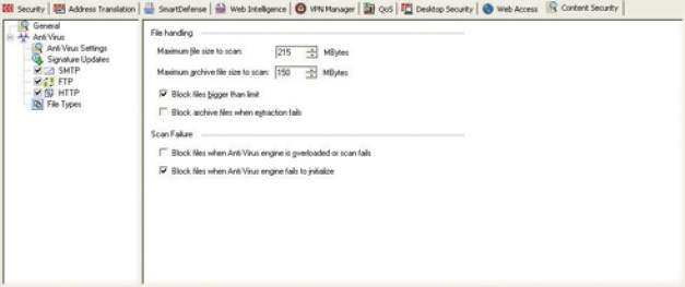 Встроенный антивирус производит проверки потоков данных, проходящих через межсетевой экран, таким образом, пресечение вирусных эпидемий происходит на периметре сети, а не, к примеру, в демилитаризованной зоне выделенным антивирусным сервером.