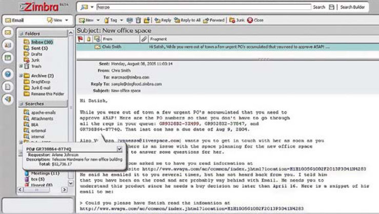 Web-клиент Zimbra наделен возможностями поиска, разметки сообщений и интеграции с серверными СУБД масштаба предприятия через веб-службы.