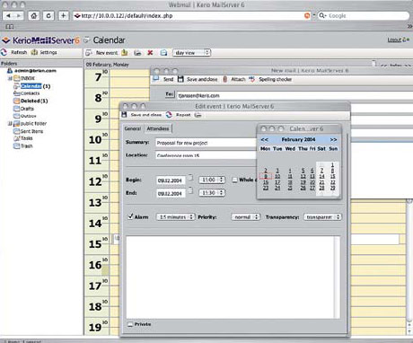 В комплект поставки сервера включены два WebMail-клиента — обычный и лёгкий. Оба клиента не требовательны к ресурсам, что обеспечивает удобный доступ с КПК и старых версий web-браузеров. Интерфейс сильно напоминает Microsoft Outlook, поэтому пользователь получает привычную почтовую среду. При этом Kerio WebMail позволяет не только читать почту, но и пользоваться коллективными и персональными календарями, контактами и задачами. Облегченная версия — Kerio WebMail Mini — предназначена для доступа к почтовым ресурсам с КПК, смартфонов и других мобильных устройств.