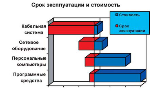 Сравнивая различные элементы ЛВС, можно заметить, что правильно спроектированная и установленная кабельная система имеет максимальный срок эксплуатации при минимальных затратах (5–7%) от общего бюджета на всю информационную систему. СКС сегодня является неотъемлемой частью современных коммерческих и общественных зданий и не может быть модернизирована без существенных затрат. Поэтому кабельные системы рассматриваются как долгосрочные инвестиции в здание. Срок эксплуатации кабельной системы составляет обычно как минимум 10–15 лет.