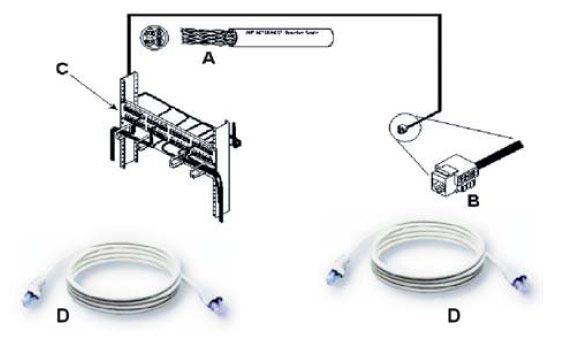 На рисунке показана простейшая конфигурация тракта кабельной системы. Горизонтальный кабель (A) разделан с одной стороны на патч-панель (С), а с другой — на модульное гнездо телекоммуникационной розетки (B). С обеих сторон для подключения к коммутатору или, соответственно, к сетевому адаптеру, установленному в рабочей станции, используются соединительные шнуры (патчкорды) (D).