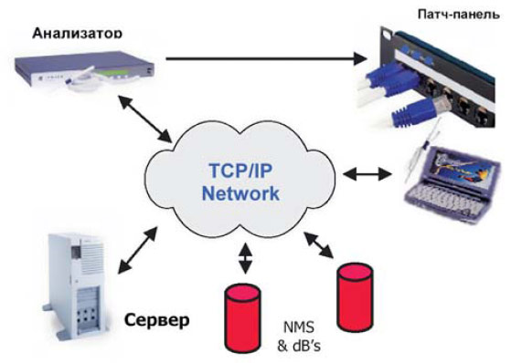 Рисунок показывает базовый принцип работы аппаратной части таких систем. Он основан на замыкании дополнительной электрической цепи при соединении портов коммутационным шнуром. Каждый порт IIMS патч-панели снабжён контактной площадкой, которая соединена с анализатором. При соединении портов специальным патчкордом, который также имеет один дополнительный контакт-датчик, электрические цепи между ними замыкаются. По этому признаку анализатор, постоянно опрашивающий состояние портов, распознаёт соединённые порты IIMS патч-панелей и отсылает соответствующую информацию на сервер базы данных, используя протокол TCP/IP.