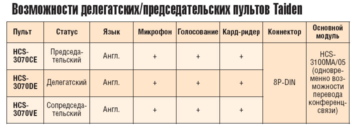 Возможности делегатских/председательских пультов Taiden