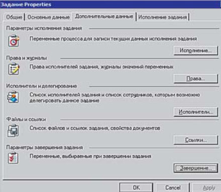 • возможность назначения дополнительных прав на обработку задания. Для обеспечения максимального удобства пользователя в зависимости от специфики конкретного процесса ему необходимо разрешать или запрещать выполнение различных специфических действий, а именно предоставлять права на отказ от исполнения задания или изменение сроков, а также возможность модификации и дополнения новых документов, просмотра родительского процесса и журнала обработки задания и пр.;