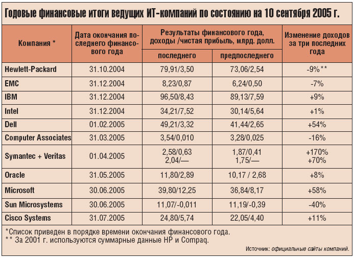 На эти моменты, связанные с финансовыми результатами ИТ-лидеров, мы обратим внимание, рассказывая об отдельных фирмах. Сейчас же только подчеркнем, что сроки окончания финансового года у компаний не совпадают, разброс в данном случае составляет девять месяцев: например, последний (на текущий момент) финансовый год у HP закончился в октябре 2004 г., а у Cisco — полтора месяца назад.