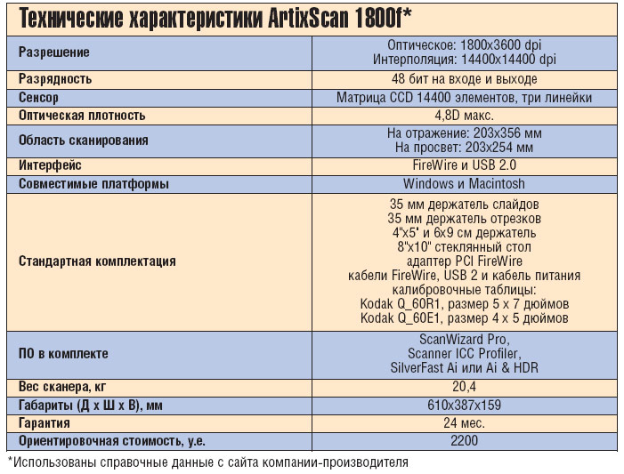 Microtek ArtixScan 1800f можно рассматривать в качестве универсального устройства для сканирования оригиналов формата А4, цветопередача которого улучшена благодаря таким особенностям, как 48-битный цвет, высокая динамическая плотность, температурный контроль CCD-матрицы, средства IT-8 калибровки цвета. Функциональность ArtixScan 1800f расширена за счёт встроенного слайд-адаптера и набора всевозможных рамок для прозрачных материалов. Субъективным критерием можно считать также вес сканера, который составляет около 20 кг: это говорит о том, что конструкция изготовлена в основном из металла, а значит, можно рассчитывать на долговечность и прецизионную точность позиционирования этого устройства.