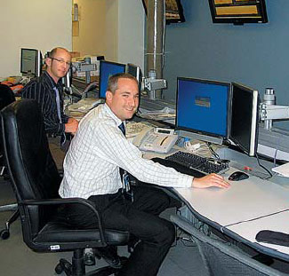 ![]() Джим Харт (слева) и Алан Осборн демонстрируют работу центра UK SOC |