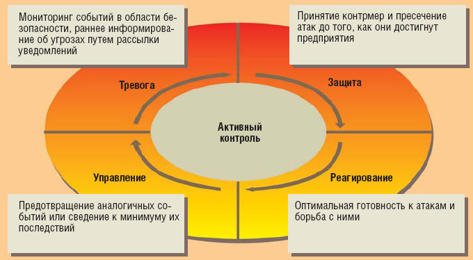 Во-вторых, и это самое главное, нужно защитить предприятие. Для этого требуется набор средств безопасности на всех уровнях корпоративной сети, что позволит предохранить информационную инфраструктуру, в то же время избежав простоев в работе и снижения производительности. В-третьих, необходимо быстро реагировать на появление угроз, что включает постоянную готовность к атаке и концентрацию усилий на её предотвращении. И наконец, надо обеспечить управление этой обширной средой безопасности путем эффективного использования технологий, данных и персонала. При этом оптимальный уровень защиты компании достигается только в том случае, когда принимаются во внимание все четыре компонента безопасности.