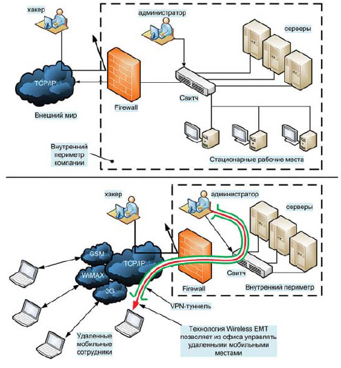 В настоящий момент рынок переживает фазу изменения парадигмы рабочего места. Верхний слайд — раньше все пользователи внутри помещения считались “своими”, а все запросы из внешнего мира — “чужими”, и, соответственно, отсекались файрволами. Нижний слайд — сегодня все большее распространение получает модель “удаленного сотрудника”. Тем не менее, мобильные сотрудники остаются подключенными к корпоративной сети, используя конвергентное окружение, а у системного администратора остается возможность управления рабочими местами, используя Wireless EMT через VPN-канал