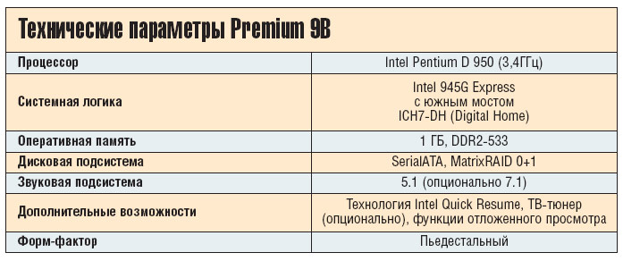 Мультимедийный компьютер “Квазар-Микро” Premium 9B основан на уже получившем распространение двухъядерном процессоре Pentium D и выполнен в традиционном пьедестальном форм-факторе. Несмотря на кажущуюся внешнюю консервативность, Premium 9B представляет собой полноценную реализацию платформы Viiv. Этот мультимедийный центр полностью управляется с пульта дистанционного управления, поддерживает воспроизведение всех известных форматов видео, а некоторые его модификации будут поставляться с ТВ-тюнером и поддержкой отложенного просмотра и записи по таймеру. В качестве процессора использован один из самых производительных настольных процессоров Intel — двухъядерный Pentium D 950 с частотой 3,4 ГГц и 4 МБ суммарной кэш-памяти второго уровня, ранее известный под кодовым названием Presler. Применение столь мощного процессора позволяет в полной мере реализовать многопоточность для нескольких пользователей одновременно. Например, один ПК могут