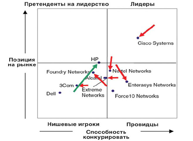 Однако выход очередной версии отчёта Gartner — “Magic Quadrant Report for Global Campus LANs” за 2004 год — заставил иначе взглянуть на ситуацию на рынке. Подразделение ProCurve Networking by НР, единственное из всех конкурентов Cisco, попало в сектор “претендентов на лидерство” “магического квадрата”. Действительно, интерес к продуктам ProCurve Networking постоянно растёт, поскольку, с одной стороны, они в состоянии удовлетворить 80% потребностей рынка корпоративных сетей, с другой — сетевые решения НР иногда дешевле конкурентных аналогов на 70%.
