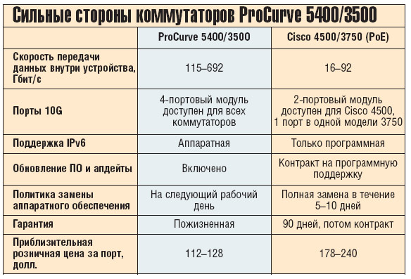 Примечательно, что ProCurve Networking позиционирует свои коммутаторы ProCurve 5400 в качестве альтернативы продуктам Cisco — Catalyst 4500/ 4900, а ProCurve 3500 — Catalyst 3750. В таблице указаны сильные стороны ProCurve в сравнении с продуктами основного конкурента.