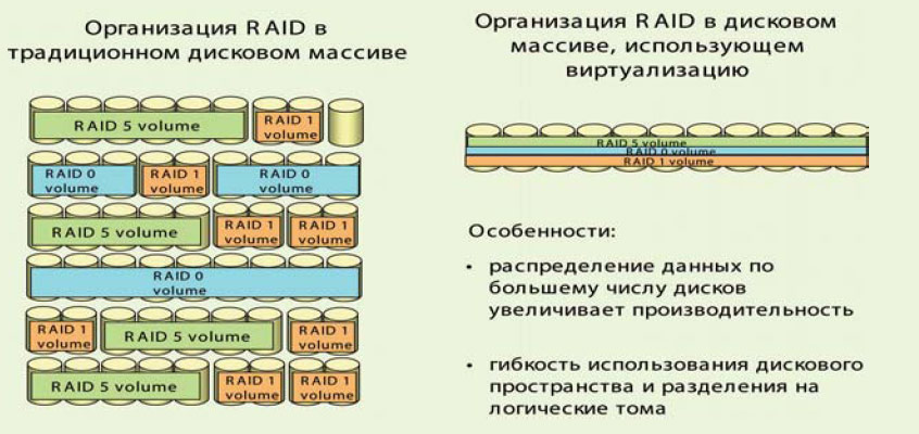 • упрощение управления, т.е. предоставление администраторам возможности работать со свойствами хранилища, а не управлять физической частью;