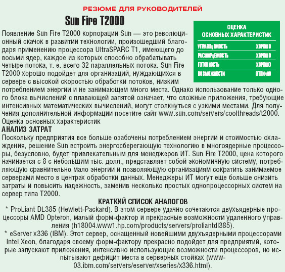 Протестированный в eWeek Labs сервер ценой порядка 26 тыс. долл. был оснащен одним восьмиядерным процессором UltraSPARC T1 с тактовой частотой 1,2 ГГц, 32 ГБ памяти DDR2 (Double Data Rate 2) и двумя дисками по 73 ГБ с интерфейсом SAS. На испытанном нами Sun Fire T2000 были установлены Sun Solaris 10 и Java Enterprise System.
