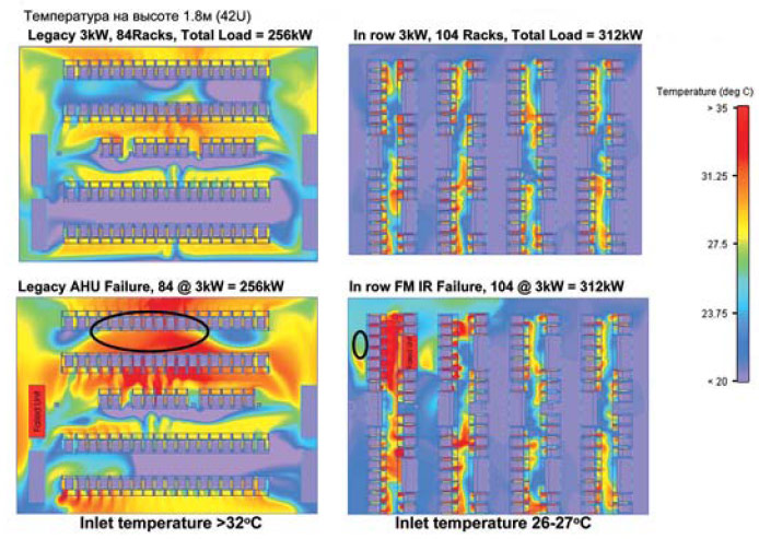 Классические схемы охлаждения с использованием подачи и отвода воздуха через фальшпол и фальшпотолок, перестают справляться с задачей в первую очередь из-за невозможности обеспечить гарантированное охлаждение, особенно в условиях изменяющейся нагрузки. Причина — в большой скорости воздуха в пространстве под фальшполом, что приводит к неравномерности его давления в разных точках пола. Это часто требует применения вентиляторов для принудительной подачи из-под фальшпола или для вытяжки горячего воздуха с задней поверхности стоек. Еще один недостаток классического решения — значительное перемешивание холодного и горячего воздуха, что приводит в итоге к неэффективной работе кондиционеров.