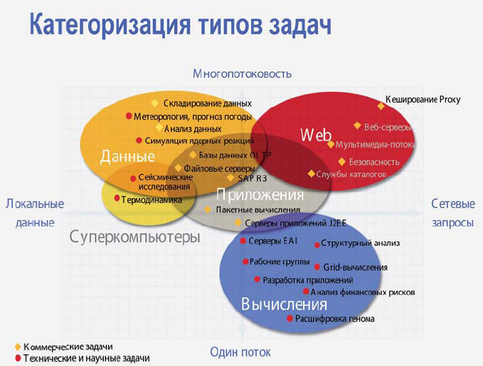 Для классификации типов выполняемых задач компания предлагает использовать систему координат, состоящую из двух осей, разбивающей все серверное пространство на четыре квадранта.