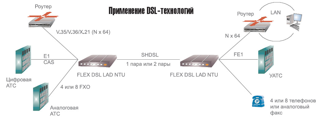 В настоящее время широко распространены решения, основанные на хDSL-технологии для транспортных сетей и сетей доступа, позволяющие организовать для заказчика любую конфигурацию и топологию, с любым набором сетевых интерфейсов. Достаточно распространенными решениями в нашей практике являются модемы серии FG Orion, которые позволяют поставщику интернет-услуг варьировать пропускную способность канала передачи данных в широком диапазоне от 192 кбит/c до 22 Мбит/c. Наличие регенератора в таких системах позволяет строить протяженные магистральные каналы передачи данных, а также использовать систему для привязки конечного пользователя к поставщику услуг. Подобное оборудование позволяет организовывать симметричные высокоскоростные VLAN-каналы передачи данных. Поддержка функции горячего резервирования канала передачи данных по DSL-линиям и возможность оптимального подбора скорости для каждой физической пары в совокупности с поддержкой протокола VLAN делают такие модемы оптимальным решением для соединения территориально распределенных Ethernet-коммутаторов по транковым портам. Этому способствует также низкая стоимость оборудования и невысокие стартовые затраты.