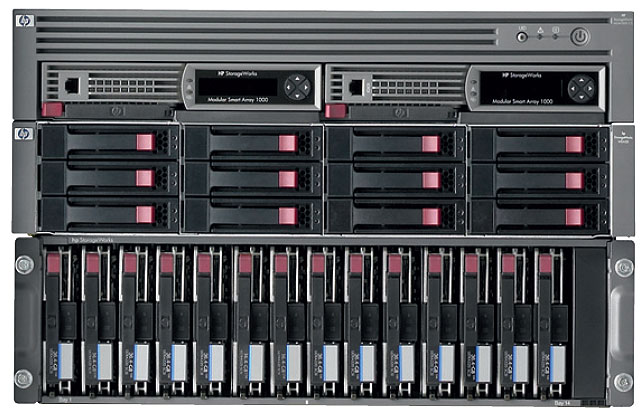 Cистема хранения HP StorageWorks MSA 1000 выполнена в форм-факторе 4U и предназначена для создания сетей SAN начального или среднего уровня. Ее особенностями являются относительно невысокая начальная стоимость при возможности модульного наращивания объема хранения до 6 ТБ. В MSA1000 может работать до 14 дисков SCSI Ultra320 с возможностью горячей замены и до 42-х при подключении двух модулей MSA30. Максимальная емкость хранения достигает 12,6 ТБ. В системе установлены два дублированных контроллера с интерфейсами Fibre Channel, предусмотрено резервирование интерфейсов и коммутаторов, поддерживается RAID 6 ADG, 5, 0, 1, 0+1. В качестве внешних интерфейсов может быть использован встраиваемый 8-портовый коммутатор.