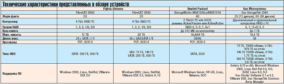 Одними из основных компонентов при построении сетей хранения данных (СХД) являются устройства хранения. На сегодняшний день в сегменте доступных по цене систем с динамически изменяемыми данными дисковые хранилища являются наиболее распространенными. Тройка крупнейших производителей дисковых хранилищ — Fujitsu-Siemens, Hewlett Packard и Sun Microsystems регулярно обновляет свои продуктовые линейки и обеспечивает широкое продуктовое предложение практически для всех разновидностей бизнес-задач.