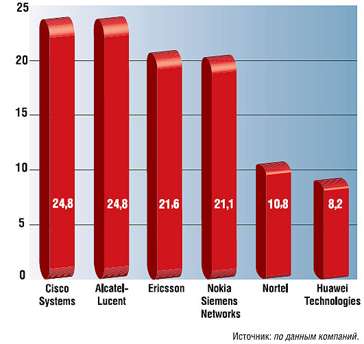 ![]() Nokia Siemens Networks среди крупнейших производителей телекоммуникационного оборудования (оборот в 2005 г., млрд. долл.) |