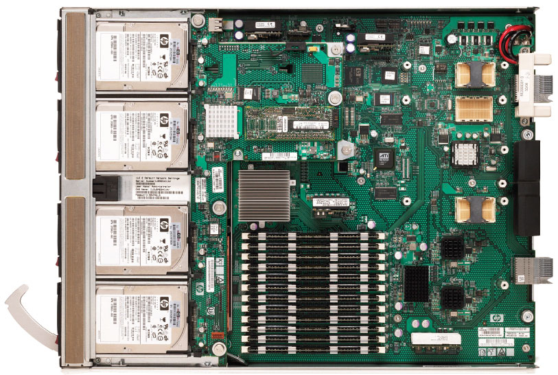 Следует отметить, что лезвия HP позволяют установить до 16 модулей оперативной памяти. Благодаря этому администраторы имеют возможность выбора: установить большой объем ОЗУ или использовать модули меньшего объема в большем количестве, чтобы добиться высокой производительности подсистемы памяти. Независимо от выбранной конфигурации ОЗУ в сервер можно ставить самые производительные процессоры, максимальное количество дисков и адаптеров.
