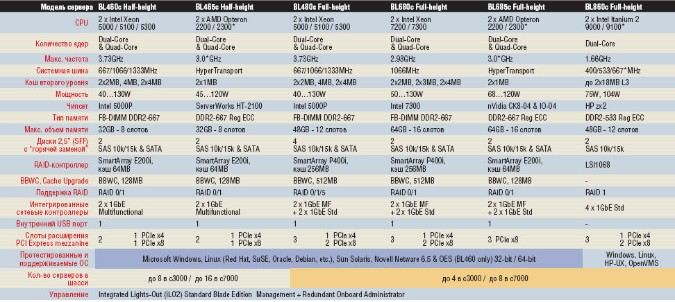 HP предлагает пять моделей серверных лезвий серии HP ProLiant Blade, которые можно установить в шасси c3000. Это BL460c, BL480c, BL680c, BL465c и BL685c, а также модель HP Integrity Blade – BL860c. Их подробные характеристики приведены в таблице.