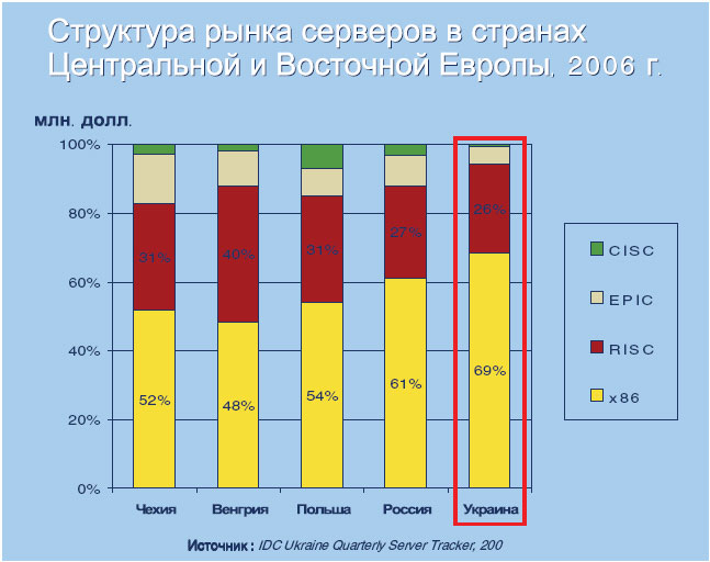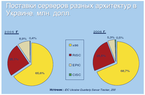 Согласно данным IDC, в первом полугодии 2007 г. суммарные поставки серверных систем архитектур RISC, EPIC и CISC (условно обозначаемых IDC non-x86) составили 280 устройств в штучном выражении и 20,5 млн долл. в денежном. По сравнению с аналогичным периодом прошлого года рост составил 48,9% в штучном и 79,2% в денежном выражении. Наибольшее количество серверов в Украину поставила Sun Microsystems – 71,4%, однако лидером по объемам продаж в денежном выражении стала HP c долей 47,2%.