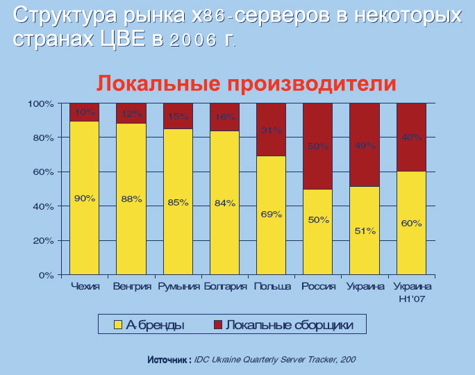 Продолжается перераспределение рынка серверов в пользу А-брендов. Согласно данным IDC в 2006 году мировые бренды контролировали 51% рынка серверов в Украине в штучном выражении. Однако, судя по результатам первой половины 2007 года, мировым вендорам удалось значительно потеснить украинских производителей, доля которых уменьшилась с 49% до 40%. По мнению аналитика компании IDC Андрея Головных, не последнюю роль в перераспределении долей рынка сыграли победы А-брендов в нескольких крупных тендерах, состоявшихся в начале 2007 года.
