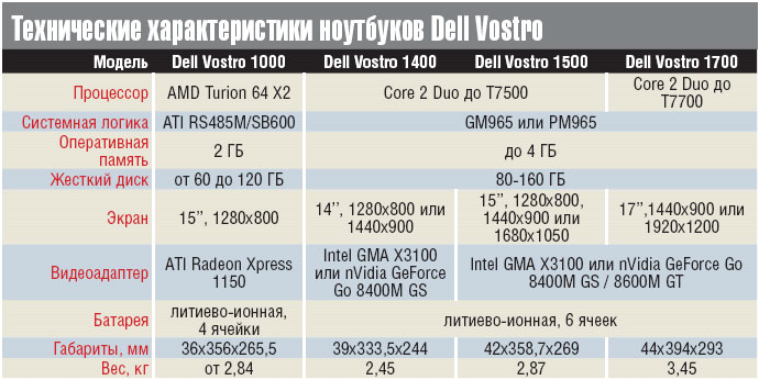В настоящее время в серии представлены четыре модели портативных компьютеров: среди них одна использует платформу AMD, а остальные — Intel. Ноутбук Vostro 1000 на процессоре AMD Turion 64 X2 обладает базовой функциональностью, однако способен справиться с большинством типичных для небольших офисов задач. В основе Vostro 1000 лежит вполне современная конфигурация: этот компьютер работает на базе системной логики ATI RS485M/SB600 со встроенной графической системой ATI Radeon XPress 1150, оснащен оперативной памятью объемом до 2 ГБ и жестким диском от 60 до 120 ГБ. Ноутбук не относится к ультрапортативным: с массой 2,84 кг и 15,4-дюймовым экраном Vostro 1000 является, скорее, заменой настольного ПК. Модель оснащена стандартными коммуникационными интерфейсами: адаптером Ethernet 10/100, модемом 56k, модулем Wi-Fi и Bluetooth.