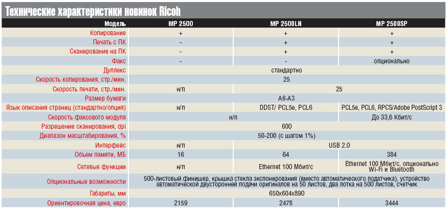 Ориентировочная начальная стоимость новинок Ricoh составляет 2159, 2478 и 3444 евро для моделей MP 2500, MP 2500LN и MP 2500SP, соответственно.