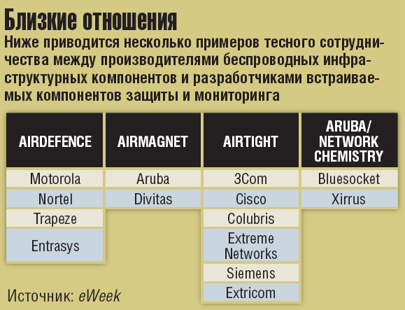 Богатый опыт работы с производителями защитных систем накопила и Cisco. Она давно уже поддерживает в своей продукции архитектуру Aironet фирмы AirDefence, а сейчас готовится к использованию контроллеров AirTight для беспроводных ЛВС.