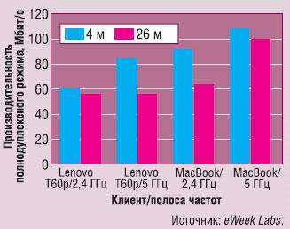 Обращает внимание, что хотя обе клиентские системы использовали чипсеты XSpan фирмы Atheros Communications (ее же технология draft 802.11n используется и в самом маршрутизаторе AirPort Extreme), они у нас показали существенно разную производительность. Это говорит о том, что при нынешней ситуации с пока еще черновым стандартом хорошее взаимодействие оборудования — даже в рамках одного семейства чипсетов — все еще не достигнуто.