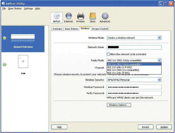 В AirPort Utility имеется мастер для легкой и быстрой настройки рабочих функций AirPort Extreme, но с точки зрения гибкости, по нашему мнению, гораздо эффективнее ручной режим. В нем мы могли задавать используемую полосу и опцию поддержки унаследованных беспроводных клиентов, а также выбирать из многих функций беспроводной безопасности. Поддерживаются протоколы WPA (Wi-Fi Protected Access) и WPA2, причем оба в вариантах PSK (Pre-Shared Key) и Enterprise, а также технология WEP (Wireless Equivalent Privacy).