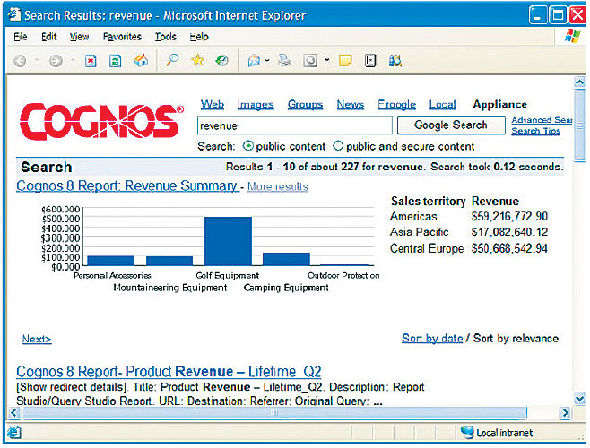 ![]() Cognos и многие другие производители инструментов бизнес-аналитики снабжают свои платформы веб-интерфейсом и упрощают их интеграцию со средствами поиска |