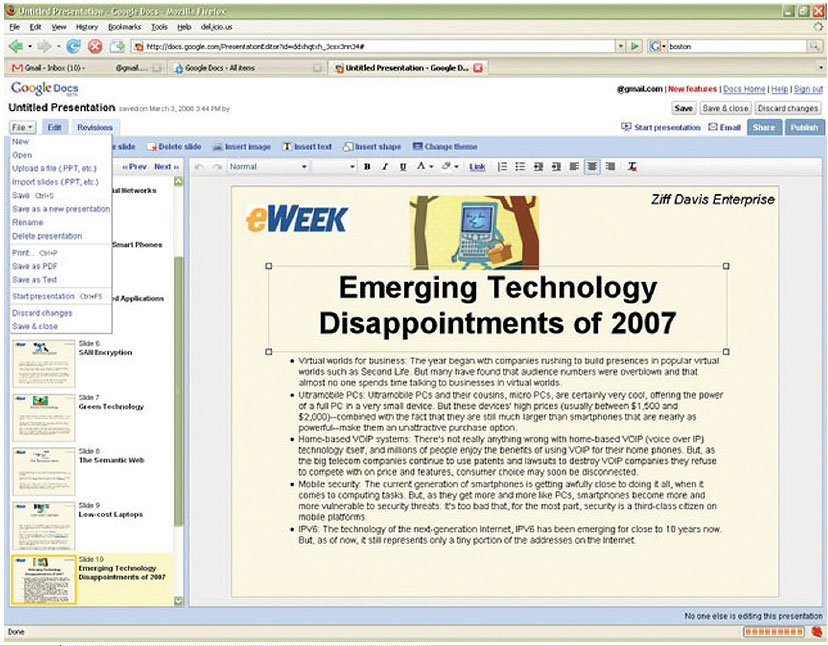 За последние годы Google проникла в очень многие области Сети сетей. Буквально во всем, начиная с электронной почты и заканчивая хостингом приложений, этот гигант не только застолбил участки, но и быстро изменил динамику рынка. Но еще опаснее для соперников фирмы то, каким способом она прорывается в сферы новых технологий. Принимаясь за любую новинку, Google начинает с того, что предлагает ее бесплатно. В результате другим приходится не только бороться с одной из крупнейших компаний планеты, но при этом еще и опускать чуть ли не до нуля цены на свою базовую продукцию.