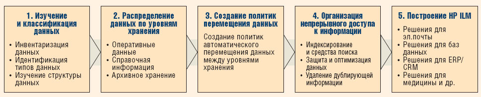 С точки зрения ILM раздельные процессы создания, идентификации, защиты, поиска, размещения, представления и удаления данных должны быть автоматизированы. Задав критерии ценности информации, время ее хранения на тех или иных носителях, администратор получает полный контроль над ее жизненным циклом. Цель состоит в достижении максимального эффекта от ее использования. Для этого в HP разработали набор продуктов и услуг (консалтинга, разработки архитектуры и внедрения), предназначенный для предприятий разного масштаба и сферы деятельности.