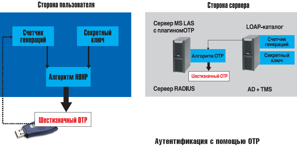 В данном случае в качестве исходной строки применяются показания таймера специального устройства или компьютера. При этом используется не точное указание времени, а текущий интервал с заранее установленными границами (например, 30 секунд). Эти данные зашифровываются с помощью ключа пользователя и отправляются на сервер вместе с именем пользователя. Сервер при получении запроса повторяет те же действия. Затем сравниваются два значения: вычисленное и полученное от пользователя.